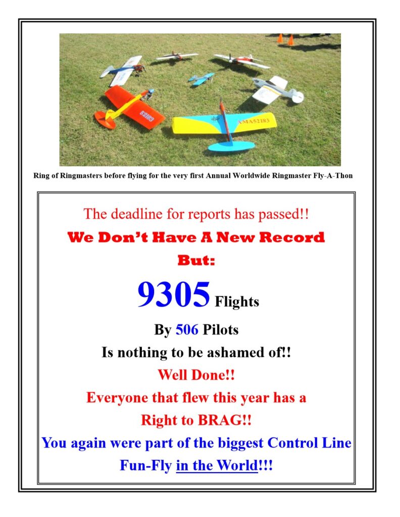 Here are The Running Totals of Pilots and Flights for the 2025, 18th Annual Worldwide Ringmaster Fly-A-Thon Reported: Oct 4th As of 10:00 PM Chicago Time (CDT) 86 flights by 16 pilots Oct 5th As of 10:00 PM Chicago Time (CDT) 562 flights by 71 pilots Oct 6th As of 10:00 PM Chicago Time (CDT) 3856 flights by 201 pilots Oct 7th As of 10:00 PM Chicago Time (CDT) 4492 flights by 251 pilots Oct 8th As of 10:00 PM Chicago Time (CDT) 4587 flights by 266 pilots Oct 9th As of 10:00 PM Chicago Time (CDT) 4683 flights by 275 pilots Oct 10th As of 10:00 PM Chicago Time (CDT) 4904 flights by 307 pilots Oct 11th As of 10:00 PM Chicago Time (CDT) 5121 flights by 327 pilots Oct 12th As of 10:00 PM Chicago Time (CDT) 6644 flights by 387 pilots Oct 13th As of 10:00 PM Chicago Time (CDT) 8386 flights by 456 pilots Oct 14th As of 10:00 PM Chicago Time (CDT) 9201 flights by 493 pilots Oct 15th As of 12:00 PM Chicago Time (CDT) FINAL 2025 FLY-A-THON TALLY 9305 flights by 506 pilots
